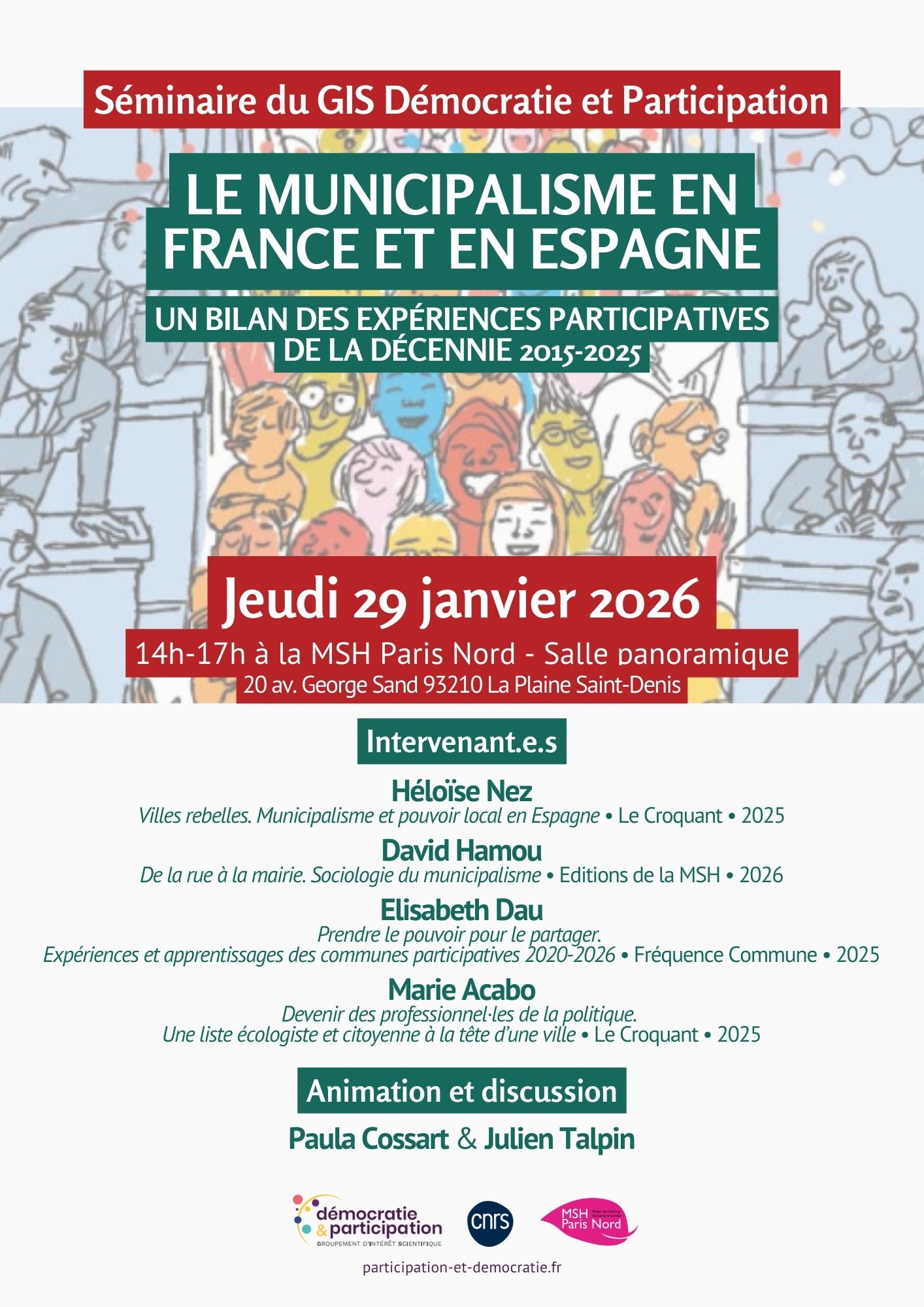 À la veille des élections municipales de 2026, les listes participatives et citoyennes se multiplient en France, avec l’ambition affichée de dé-profesionnaliser la politique et de revitaliser la démocratie à l’échelle locale. Ces listes s’inspirent de plusieurs précédents, qui ont vu au cours de la dernière décennie des coalitions citoyennes remporter des élections et gouverner des villes de tailles diverses, notamment en Espagne et en France. Quel bilan tirer alors de ces expériences de gouvernement citoyen des municipalités ? Ont-elles porté un véritable renouvellement de l’action politique, ou se sont-elles au contraire diluées dans la sphère de la représentation politique professionnelle ? Listes participatives, municipalisme voire communalisme, quelles sont les similarités et les divergences entre ces projets politiques ? Le séminaire « Le municipalisme en France et en Espagne. Un bilan des expériences participatives de la décennie 2015-2025 » vise à présenter quatre récentes publications qui reviennent sur ces expériences citoyennes de démocratie locale et leurs défis.