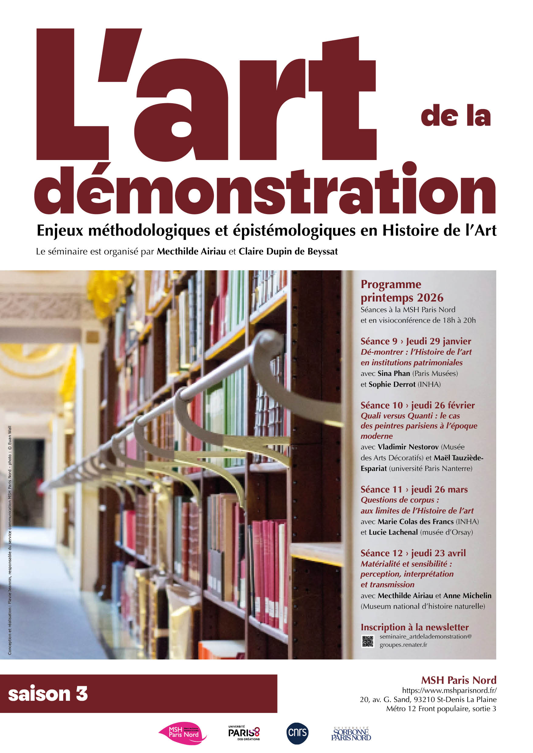 MSH Paris Nord 20, avenue George Sand, La Plaine Saint-Denis, Métro ligne 12 : « Front populaire », accessible aux personnes à mobilité réduite, FranceEnjeux méthodologiques et épistémologiques en Histoire de l’Art Le séminaire L’art de la démonstration. Enjeux méthodologiques et épistémologiques en Histoire de l’Art, réunit mensuellement des chercheur·ses en histoire de l’art, …